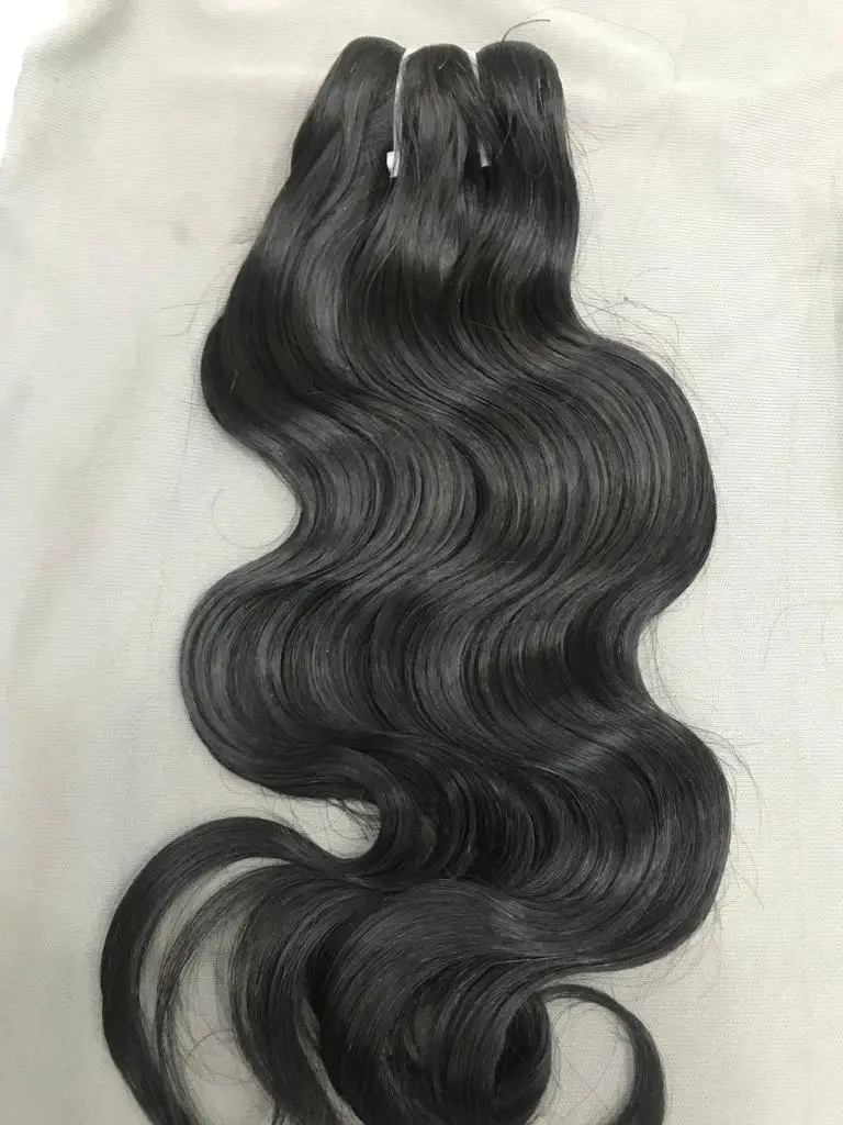 Las extensiones de cabello con weft en negro están cuidadosamente elaboradas mediante la costura o el tejido de mechones de cabello para formar una tira, que luego se enrolla en un paquete.